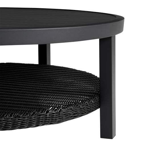 Grand Black Aluminum Outdoor Round Conversation Table with Wicker Shelf