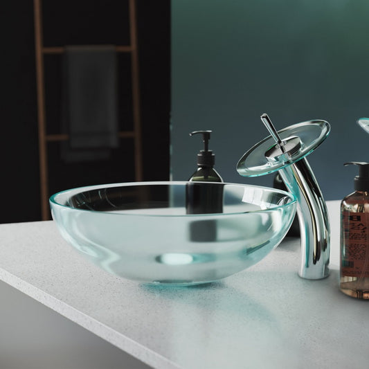 Swiss Madison Cascade 16.5 Glass Vessel Sink with Faucet, Clear