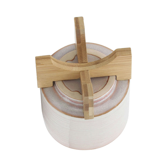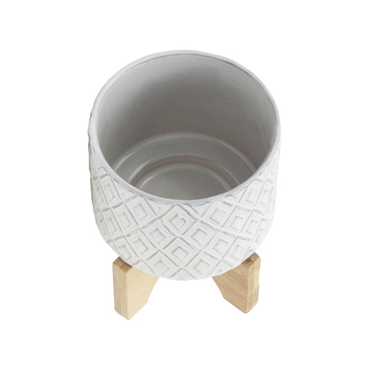 Ceramic 5" Dotted Planter W/wood Stand, Ivory