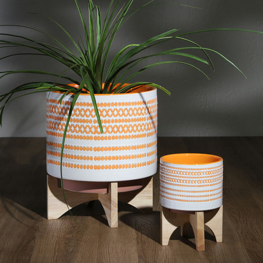 Ceramic 5" Aztec Planter On Wooden Stand, White & Orange