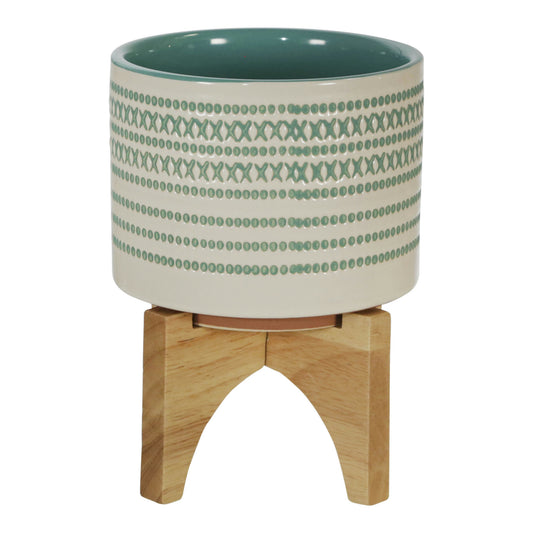 Ceramic 5" Aztec Planter On Wooden Stand, White & Olive