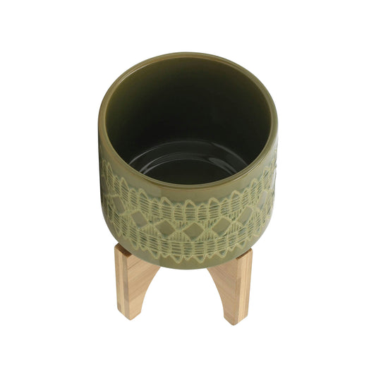 Ceramic 5" Aztec Planter On Wooden Stand, Olive