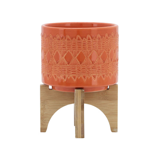 Ceramic 5" Aztec Planter On Wooden Stand, Orange & White