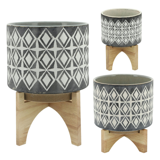 Ceramic 8" Planter On Stand, Gray, Romb Pattern
