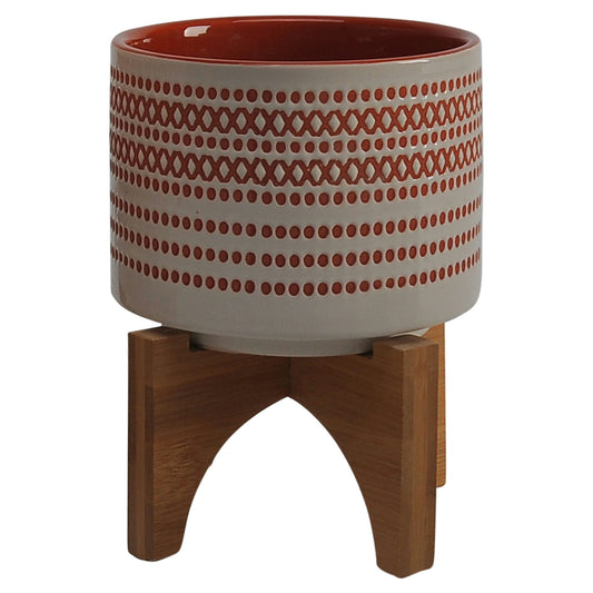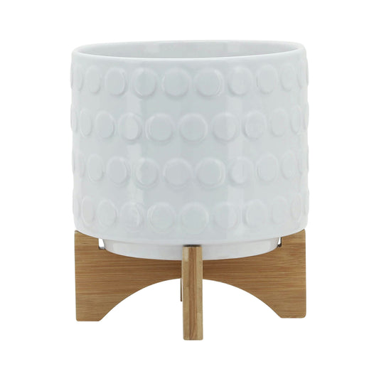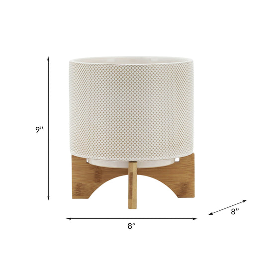 Ceramic 8" Dotted Planter W/wood Stand, Ivory