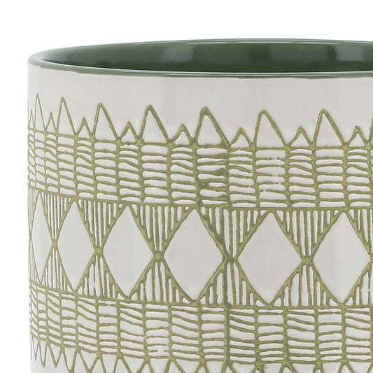 Ceramic 8" Aztec Planter On Wooden Stand, White & Olive