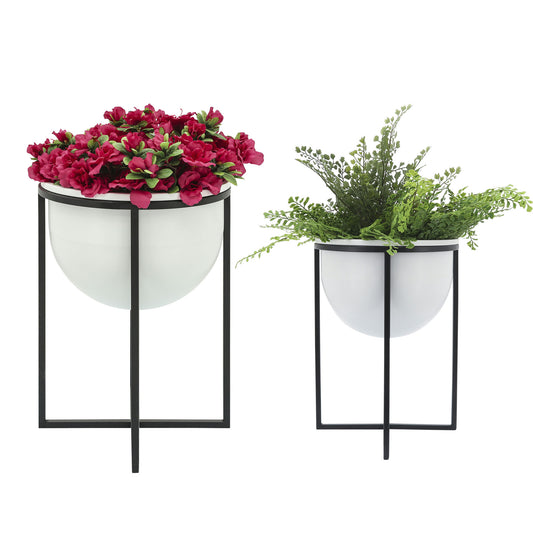 Metal S/2 11/12" Planters W/ Stand, Wht/blk