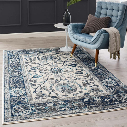 Entourage Samira Distressed Vintage Floral Persian Medallion 5x8 Area Rug, Ivory and Blue