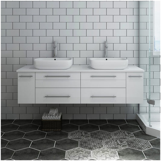 Lucera 60" White Wall Hung Modern Bathroom Cabinet w/ Top & Double Vessel Sinks