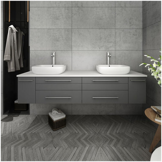 Lucera 72" Gray Wall Hung Modern Bathroom Cabinet w/ Top & Double Vessel Sinks
