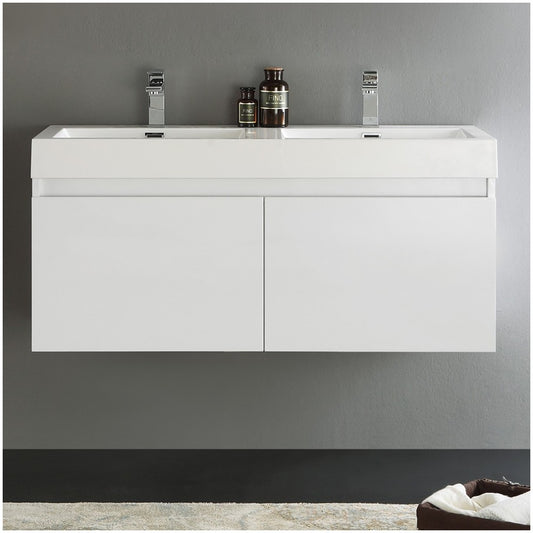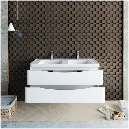 Mezzo 48" White Wall Hung Double Sink Modern Bathroom Cabinet w/ Integrated Sink