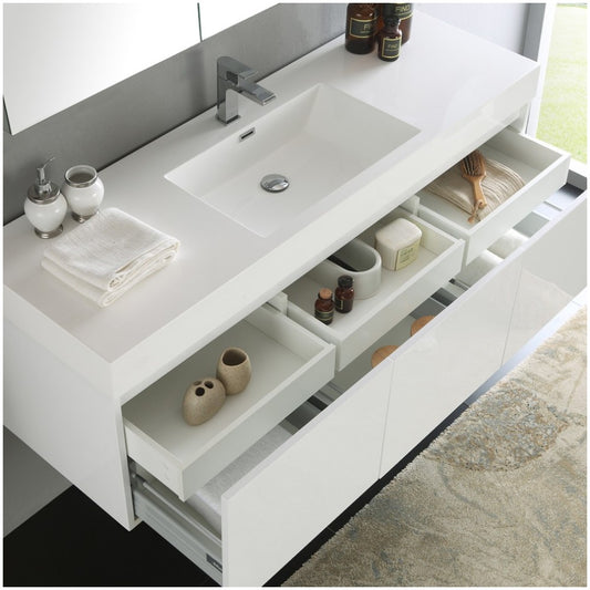 Mezzo 60" White Wall Hung Single Sink Modern Bathroom Vanity w/ Medicine Cabinet