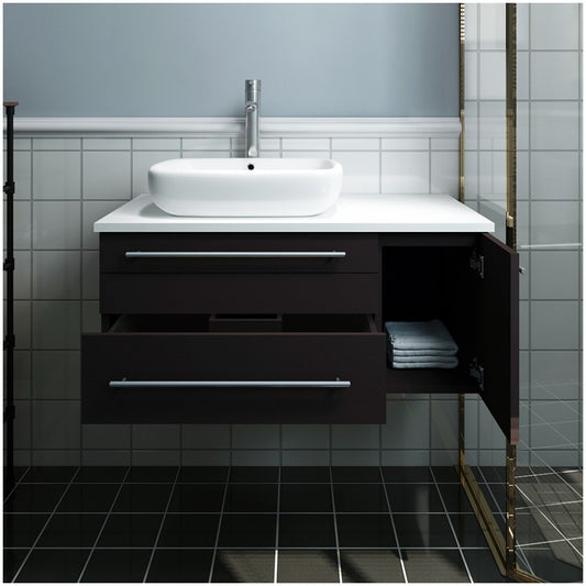 36 Espresso Wall Hung Bathroom Cabinet w/ Top & Vessel Sink - Left Version