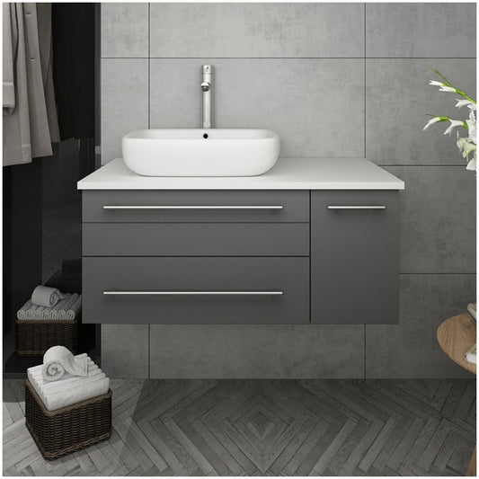 36 Gray Wall Hung Modern Bathroom Cabinet w/ Top & Vessel Sink - Left Version