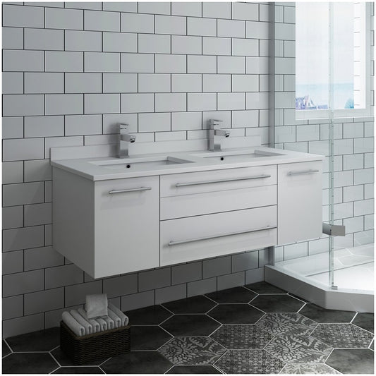 48 White Wall Hung Modern Bathroom Cabinet w/ Top, Double Undermount Sinks