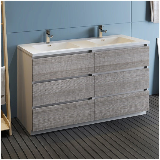 60 Ash Gray Free Standing Modern Bathroom Cabinet w/ Integrated Double Sink
