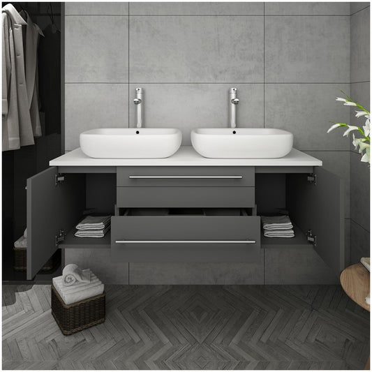 Lucera 48" Gray Wall Hung Modern Bathroom Cabinet w/ Top & Double Vessel Sinks