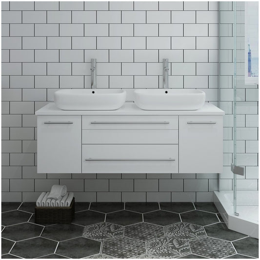 Lucera 48" White Wall Hung Modern Bathroom Cabinet w/ Top & Double Vessel Sinks