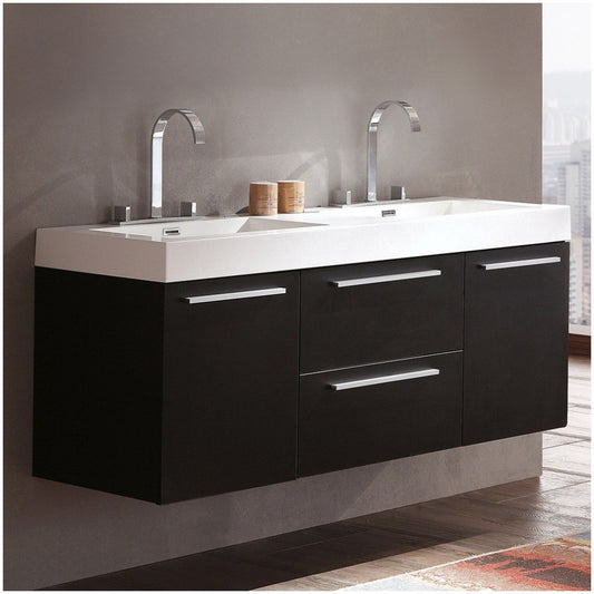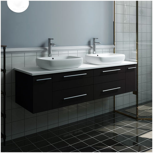 Lucera 60 Espresso Wall Hung Modern Bathroom Cabinet w/ Top, Double Vessel Sinks