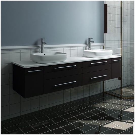 Lucera 72 Espresso Wall Hung Modern Bathroom Cabinet w/ Top, Double Vessel Sinks