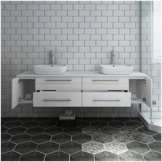 Lucera 72" White Wall Hung Modern Bathroom Cabinet w/ Top & Double Vessel Sinks