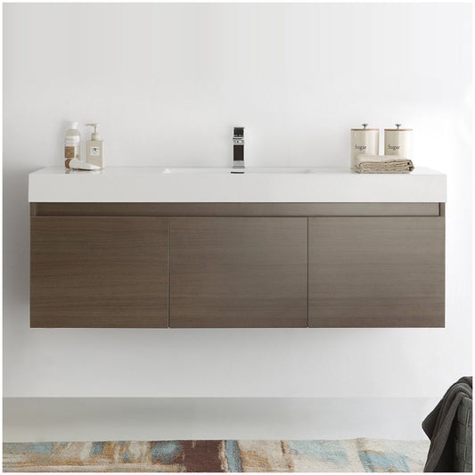 Mezzo 60 Gray Oak Wall Hung Single Sink Bathroom Cabinet w/ Integrated Sink