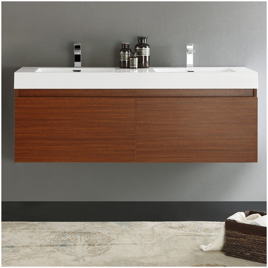 Mezzo 60" Teak Wall Hung Double Sink Modern Bathroom Cabinet w/ Integrated Sink
