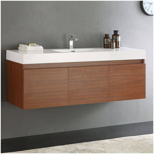 Mezzo 60" Teak Wall Hung Single Sink Modern Bathroom Cabinet w/ Integrated Sink