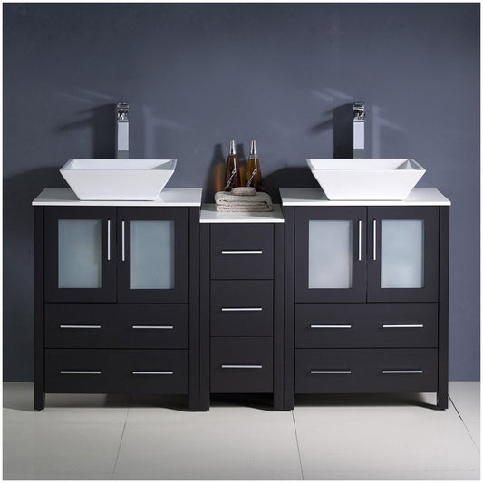 Torino 60" Espresso Modern Double Sink Bathroom Cabinets w/ Tops & Vessel Sinks