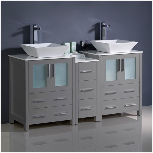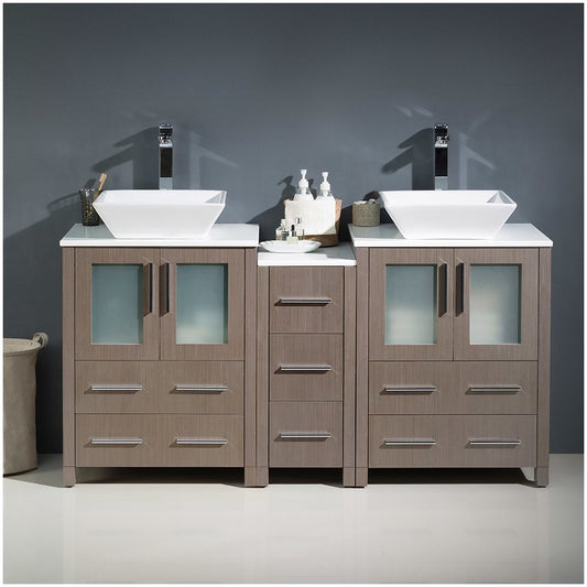 Torino 60" Gray Modern Double Sink Bathroom Cabinets w/ Tops & Vessel Sinks