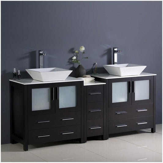 Torino 72" Espresso Modern Double Sink Bathroom Cabinets w/ Tops & Vessel Sinks