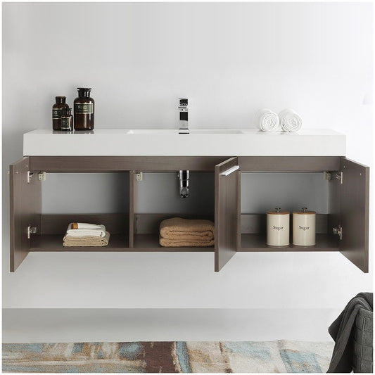 Vista 60 Gray Oak Wall Hung Single Sink Bathroom Cabinet w/ Integrated Sink