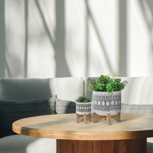 Cer, S/2 5/8" Aztec Planter On Wooden Stand, Black