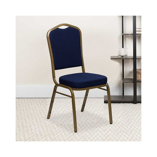 Crown Back Stacking Banquet Chair in Navy Blue Patterned Fabric - Gold Frame