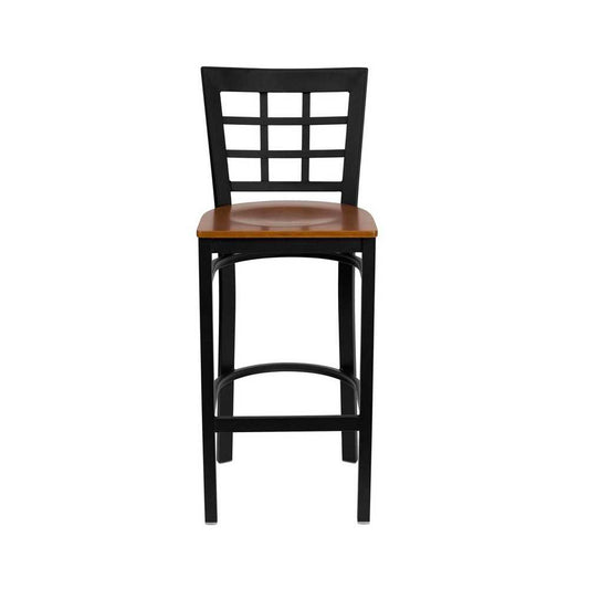 Black Window Back Metal Restaurant Barstool - Cherry Wood Seat