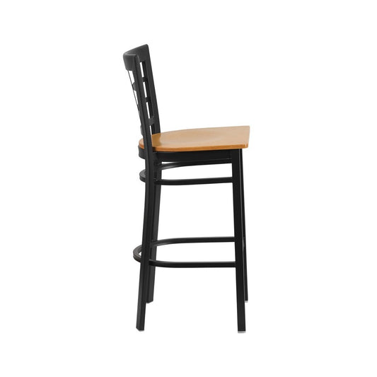 Black Window Back Metal Restaurant Barstool - Natural Wood Seat