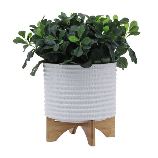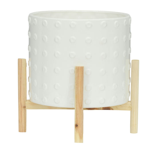 12" Ceramic Dotted Planter W/ Wood Stand, White