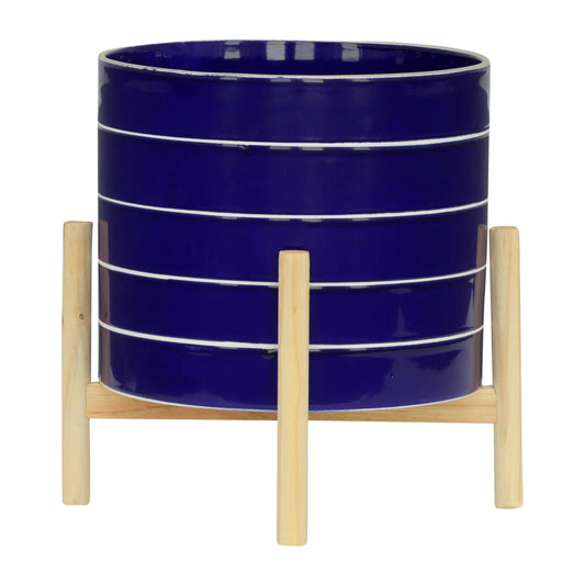 12" Ceramic Fluted Planter W/ Wood Stand, Black
