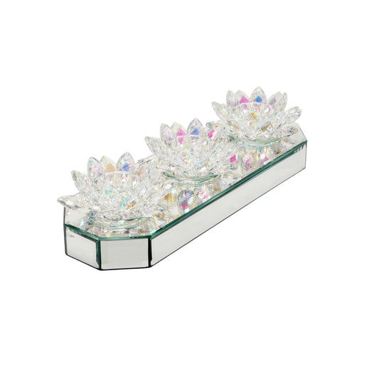 Glass 13" 3 Lotus Mirrored Candle Holder, Rainbow