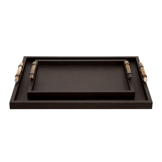 Wood S/2 14/18" Faux Leather Tray, Brown