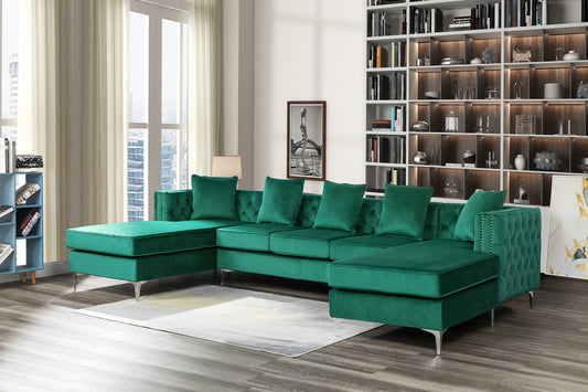 Lilola Home Ryan Green Velvet Double Chaise Sectional Sofa with Nail-Head Trim