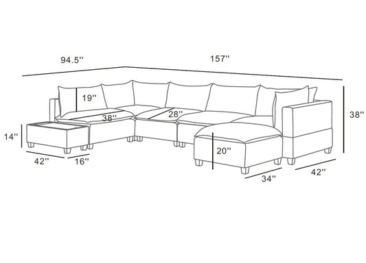 Madison Light Gray 7-Piece Modular Sectional Chaise, USB Storage Console Table