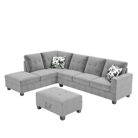 Ruby Light Gray Velvet Reversible Sleeper Sectional, Storage Chaise, Side Pocket
