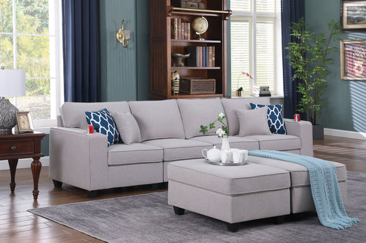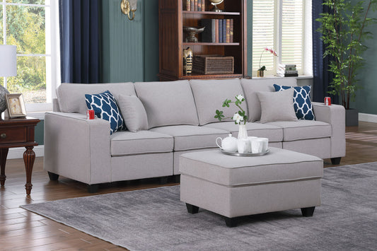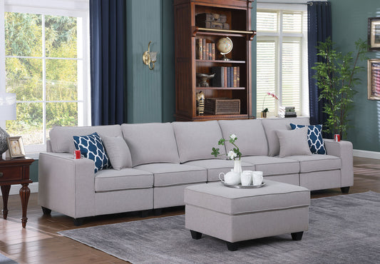 Cooper Light Gray Linen 5-Seater Sofa with Ottoman and Cupholder, 89131-19A