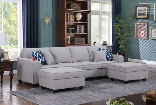 Cooper Light Gray Linen 4-Seater Sofa with 2 Ottomans and Cupholder, 89131-17B