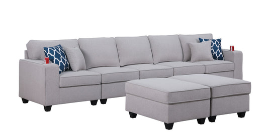 Cooper Light Gray Linen 5-Seater Sofa with 2 Ottomans and Cupholder, 89131-20B