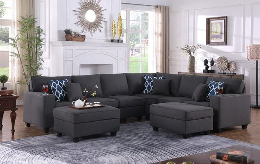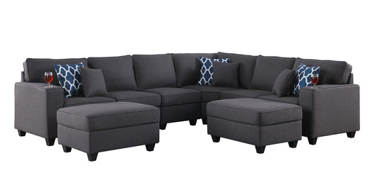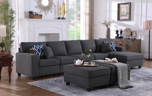 Cooper Dark Gray Linen 7Pc Modular Sectional Sofa Chaise with Ottoman, Cupholder
