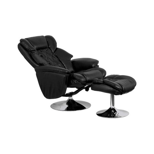 Transitional Multi-Position Recliner and Ottoman with Chrome Base in Black LeatherSoft