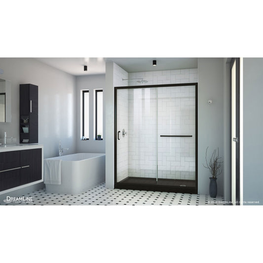 Infinity-Z 30 in. D x 60 in. W x 74 3/4 in. H Clear Sliding Shower Door in Satin Black, Center Drain Black Base