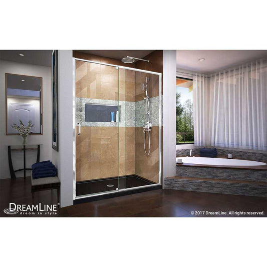 Flex 34 in. D x 60 in. W x 74 3/4 in. H Semi-Frameless Pivot Shower Door in Chrome with Center Drain Black Base Kit